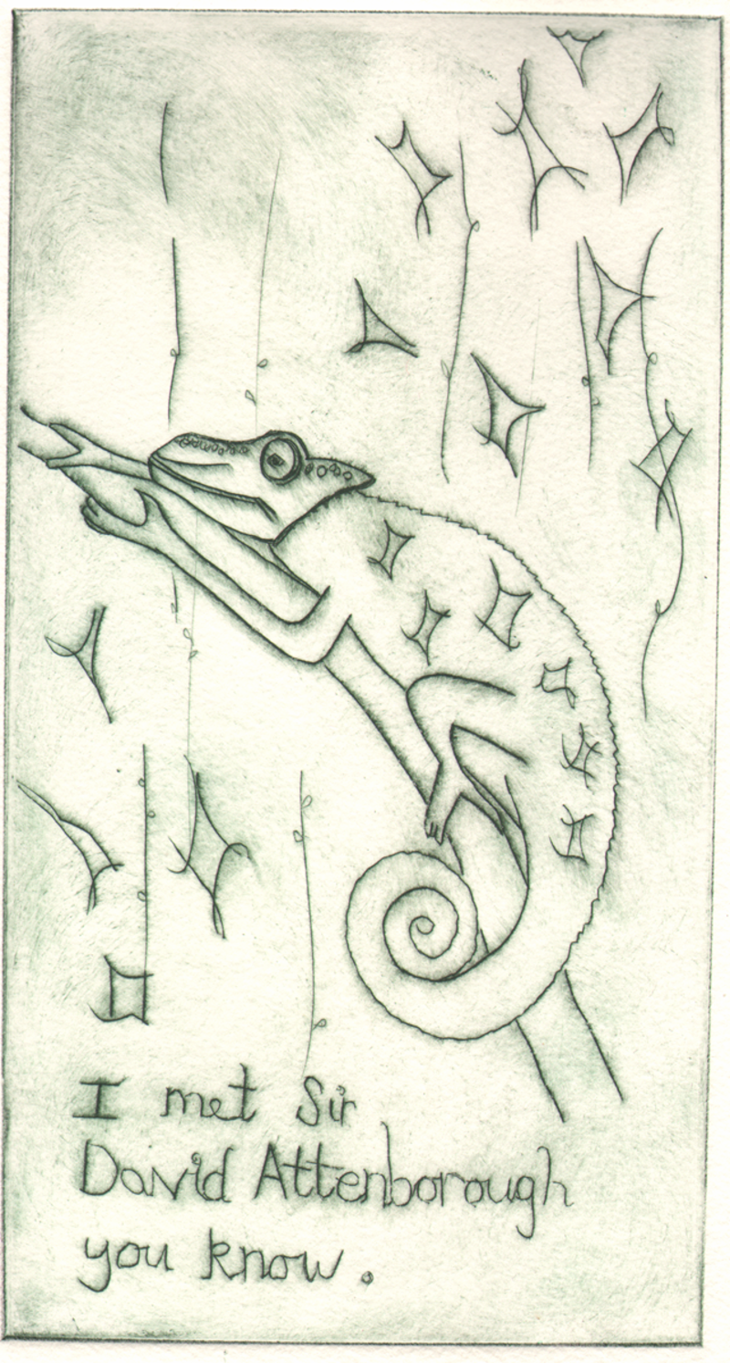 Drypoint etching on printmaking paper, edition of 6 plus 3 hand coloured artist proofs, includes frame.